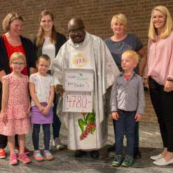 „Hier ist ein Koffer mit ganz viiiiiiiel Geld für Dich!“ sagte die 5-jährige Franziska gegen Ende des Jubiläumsgottesdienstes am 14. September 2019 zu Kaplan Coffi und übergab mit Erzieherinnen aus allen vier katholischen Kindergärten der Pfarreiengemeinschaft einen symbolischen Geldkoffer.