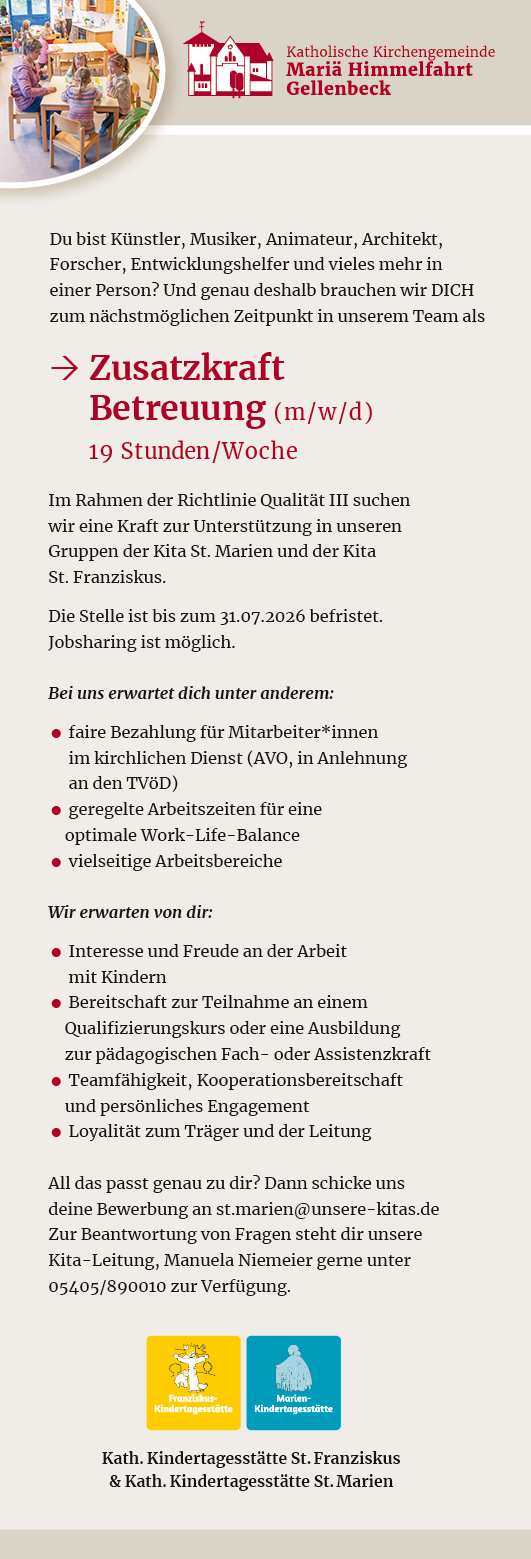 An dieser Stelle informieren wir gerne über offene Stellen in den Kindergärten unserer Pfarreiengemeinschaft. Wir freuen uns auf Ihre Bewerbung!
